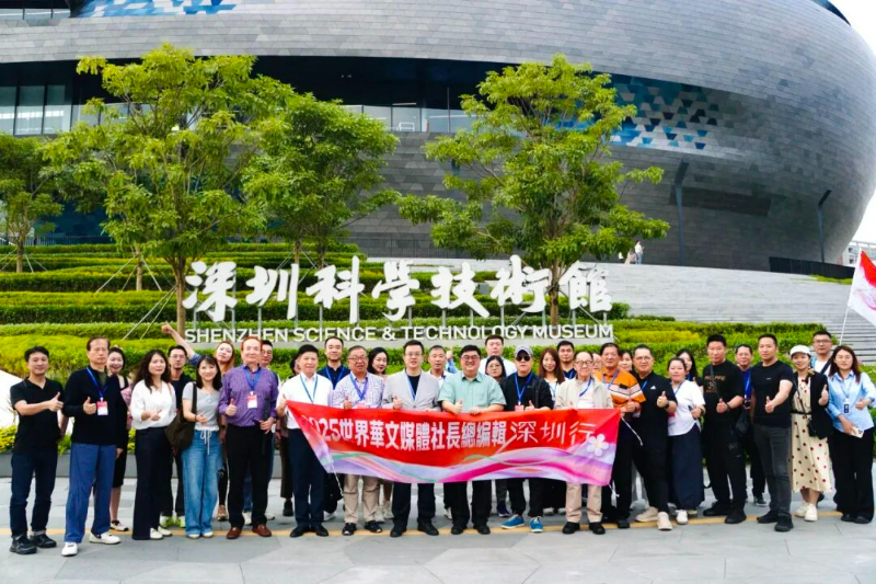 「2025世界华文媒体社长总编辑深圳行」嘉宾在深圳科学技术馆留影